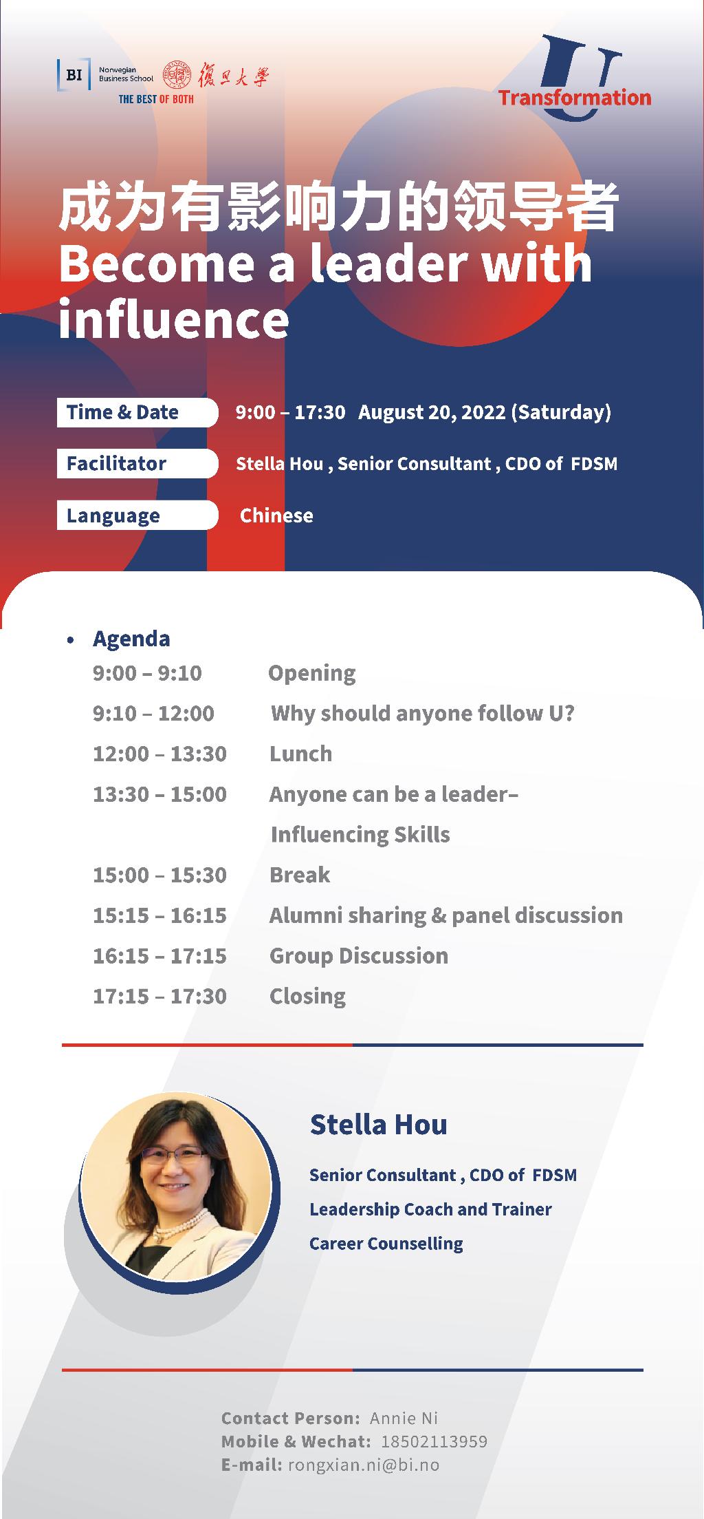 现代管理之父彼得德鲁克在《管理未来》说提到:“真诚而值得信赖是领导者的品质。没有信赖,就没有追随者。说到底,对领导者的唯一定义就是有追随者。” 8月我们荣幸邀请到复旦大学管理学院职业发展中心特聘高级顾问侯蓓莉老师与大家分享关于领导者影响力的理论与实践经验。为什么下属要追随你?你的领导优势有哪些?如何提升个人影响力成就职涯?